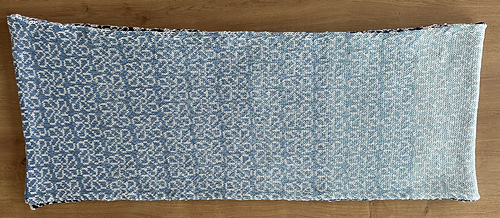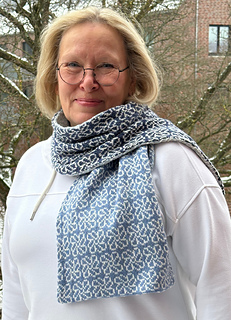 Schon lange wollte ich einmal einen Bobbel mit einem Farbverlauf ausprobieren. Die harmonischen Übergänge von dunkelblau über mittelblau und hellblau bis zu hellem grau der Wolle „Whirl“ von Scheepjes sprachen mich an. Dafür habe ich ein einfaches Blumenmuster entwickelt, das sich auf 100 Maschen je Reihe allover über einen Schal und die verschiedenen Blautöne erstreckt. So konnte ich ausprobieren, wie lange der Farbverlauf reichen wird.