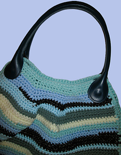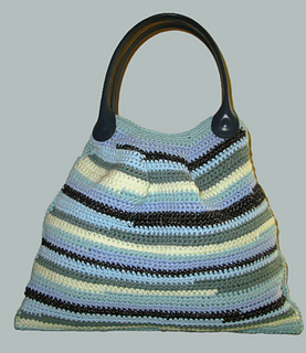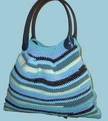 Ce sac cabas à rayures horizontales est une pièce unique, réalisée au crochet avec des restes de laine dans des teintes variées de bleus, verts et blancs.
