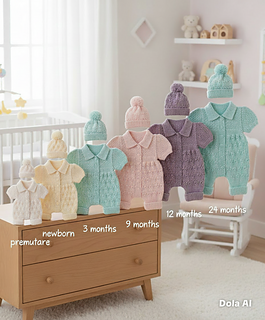 The very popular 3 piece Bluebell romper, hat, and booties set has been multisized to offer sizes from a premature baby to 24 months.