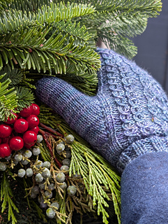 Blueberry Twist is the second pattern in my Cozy Clouds Collection. The Cozy Clouds patterns are all double layered mittens created using Fyberspates Cumulus brushed alpaca and silk as the inner layer for cozy warmth, with smooth merino on the outside for incredible stitch definition in the lace - and gorgeous Cumulus clouds peeking through each YO!