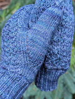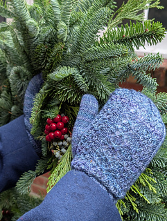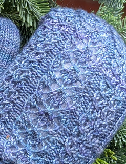 The Blueberry Twist Lace motif is a simple 8 row center lace repeat with alternating mock cable columns running up each side. The lace pattern is the same for both mitten sizes, and mittens are knit to your own hand length. Lace pattern is both charted and written.
