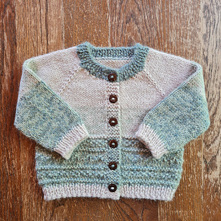 Green cardigan (3-6m): DROPS Alpaca. Yarn A = 7323 sea fog, Yarn B = 9036 wheat, Yarn C = 9038 sage green