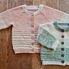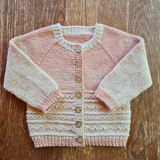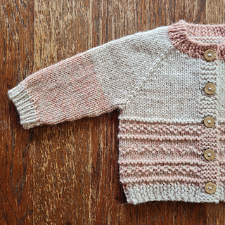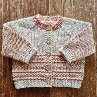 Pink cardigan (9-12m): DROPS Flora. Yarn A = 22 white fog, Yarn B = 30 desert rose, Yarn C = 31 sand