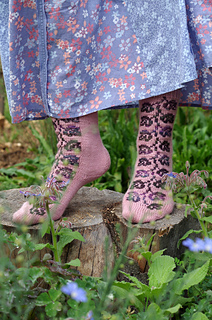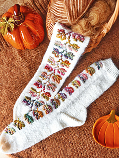 Bluszcz Socks to efektowne skarpetki ozdobione na przodzie botanicznym wzorem. Przywodzą na myśl fasadę budynku lub pień drzewa malowniczo opleciony pędami bluszczu. Wykonywane są gładkim ściegiem pończoszniczym z panelem w technice roosimine. Skarpetki dziergane są od ściągacza do palców, z elegancką i wygodną piętą typu strong heel.