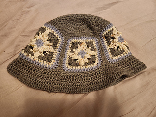 The granny squares worked individually and joined them together. And then attached the flat circle for the top of the hat and lastly added brim.