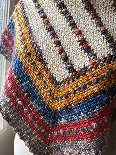 This crochet shawl begins with an asymmetrical triangle worked side-to-side in a textured mesh fabric punctuated with cheerful bobbles. Once the body of the shawl is complete, the work rotates to form a traditional top-down triangle, allowing the design to expand into a flowing moss-stitch border accented with additional bobble details.