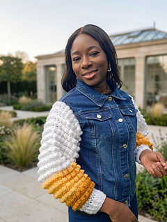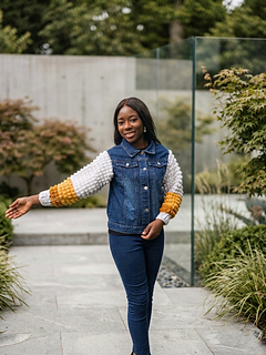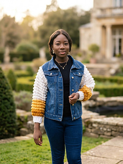 Construction: Sleeves are crocheted separately and attached to a denim jacket
