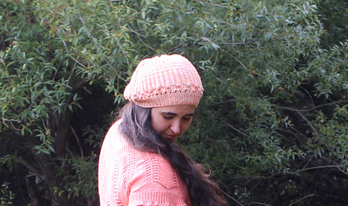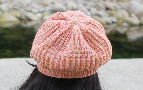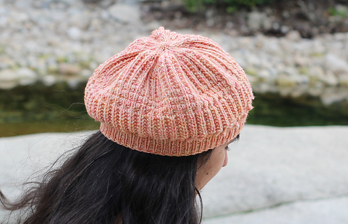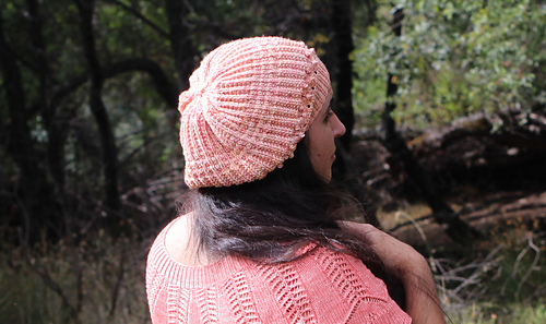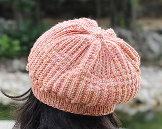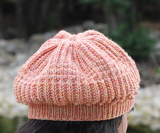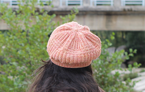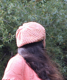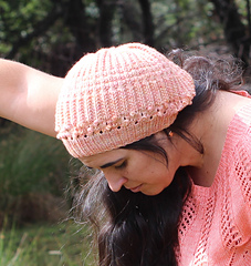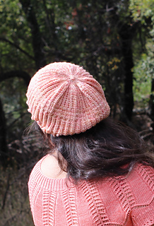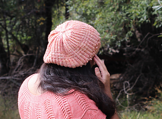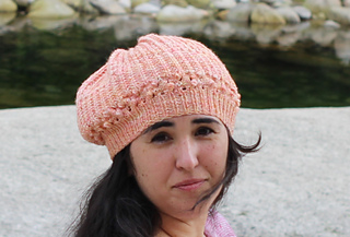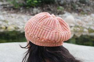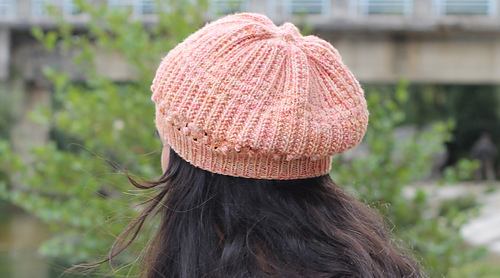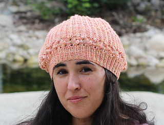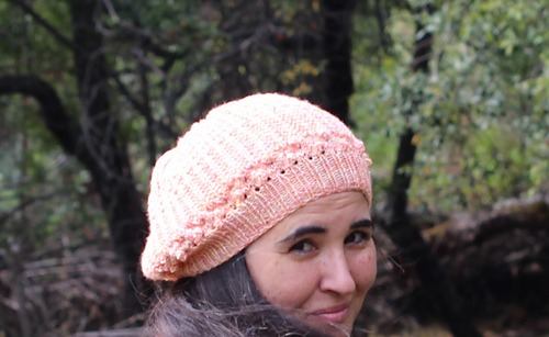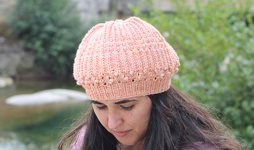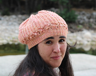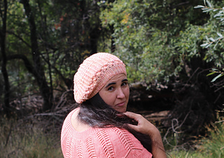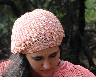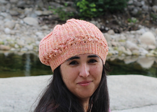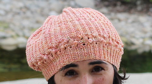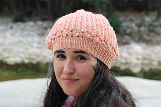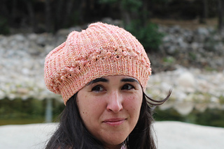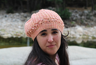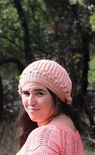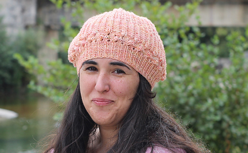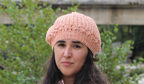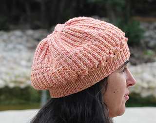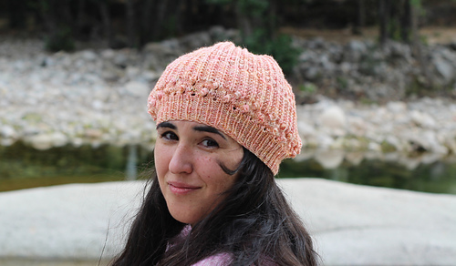 Esta boina es una boina tejida bottom up (de abajo a arriba). Comienza en un montaje elástico, con dos vueltas en plano con puntos deslizados para darle elasticidad (como ocurre en el montaje italiano y en el tubular), después se arranca a tejer un elástico simple 1x1, tras el cual vamos a hacer una sección de aumentos con calados y bodoques. El cuerpo de la boina se teje con varias secciones de texturas, muy elásticas. Por último se hace una sección con disminuciones y terminamos cerrando con una costura kitchener.