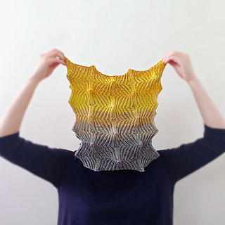 In the smaller cowl shown, two yarns are held together throughout.