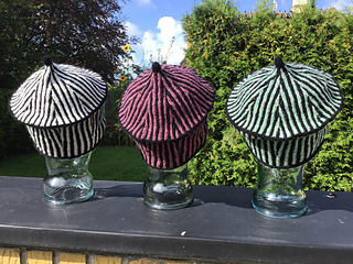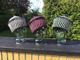 En bolchestribet hue, strikket med 2 tråde i Supersoft, Blackhill højlandsuld eller Saga fra Filcolana. Eller tynd uld i eget valg med en løbelængde på 250-275 m på 50g. Huen starter med 12 p. rib, men hvis man synes at rib med 2 farver er svært, så er der i opskriften et link til en YouTube video, hvor jeg viser teknikken. Alternativt kan den strikkes i glat.