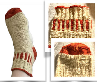 Sock features include bold basket stitch on instep and leg, Bosnian patch toe, garter stitch short-row heel, as well as corrugated and fancy ribbing. Pattern written for Magic Loop method but can be adapted for 2 circular needles or 5 double-point needles.