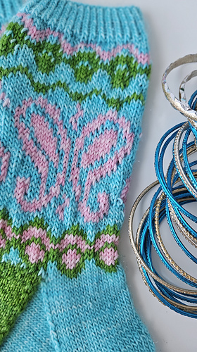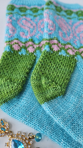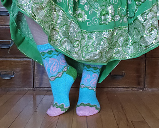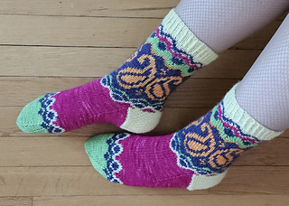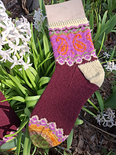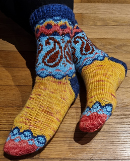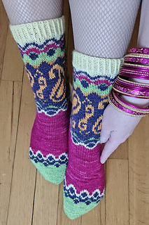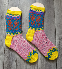 Inspired by the joyful energy of Indian dance, the Bollywood Socks are a true celebration of colorwork. This pattern invites you to play with a vibrant palette to highlight its iconic paisley motifs and graphic borders.