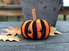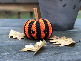 Stitched up in soft acrylic yarn with bold black ridges and bright orange panels, it looks like something straight from a friendly witch’s windowsill. Its round shape, gentle curves, and beautifully scented cinnamon stick stem make it perfect for decorating your mantel, desk, or trick-or-treat table.