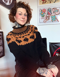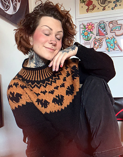 This sweater is worked seamlessly from the top down. The sleeves and body are separated and worked in the round.