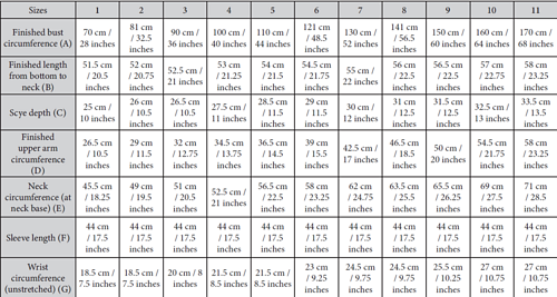 Measurements in the chart are finished measurements. Choose a size that is 0-11 cm / 0-4.5 inches larger than your bust circumference.