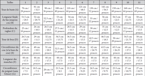 Les mesures dans le diagramme sont les mesures finales du chandail. Choisissez une taille qui est 0-11 cm / 0-4.5 pouces plus large que votre tour de poitrine.