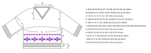 58, 62, 67)” or 96 (108, 120, 132, 144, 156, 168) cm for finished bust measurement of garment.
