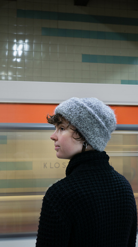 After working the second fold the knitting direction is changed so the the fold and the inner part of the hat will both appear with the stockinette stitch side outwards.