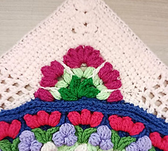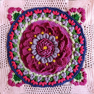 This installment is the start of the blanket: from Round 29 the design expands and begins squaring the mandala/cushion into a blanket. Written instructions with step photos and two video tutorials. US crochet terms.