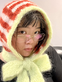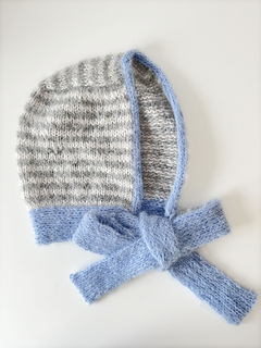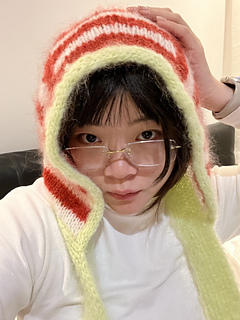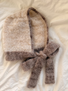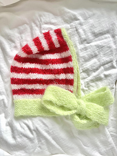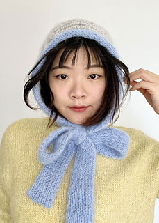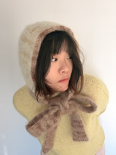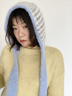 Bow Hood is a loosely fitted hood knitted with fluffy bulky-weight yarn, featuring a striped stockinette main body. An I-cord edge is worked along the brim to create a clean, contrasting finish. The bow that gives this pattern its name is formed with a double-knitted band and attached to the lower edge of the hood. Follow my Instagram: @mayinmade for a video tutorial on how to make a perfect bowknot ;)