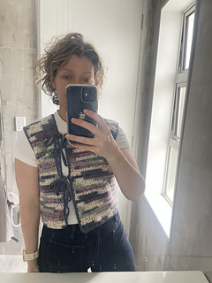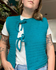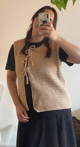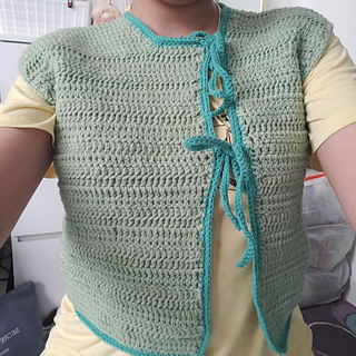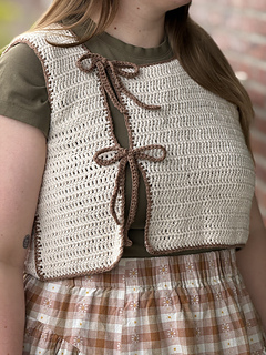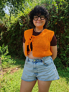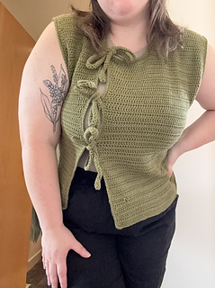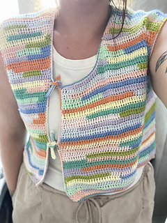 You can use the pattern to create your own Bowy Vest! The Bowy Vest is assymetric and features bows to attach it. This pattern is made to measure, which means it can be made with any yarn and hook size and you do not need to crochet the same gauge. It can be adjusted to any body type. You can also choose on what side of your body you want the straps, the vest is worked top down.
