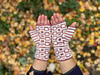 The mitts are knit bottom up in the round using either Magic Loop or dpns. There is a thumb gusset with detailed instructions on how to do the increases and where to place stitch markers.