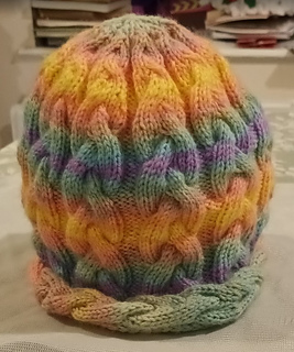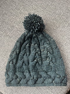 The hat begins by knitting the brim seperately, side to side. The brim starts with a provisional cast on and a braided cable is knit with a slip stitch icord edge for the bottom of the brim. The ends of the brim are attached using kitchener stitch. Stitches for the body of the hat are picked up and knit along the top edge of the brim, and the remainder of the hat is knit bottom up, with more braided cables and standard ssk/k2tog decreases for the crown shaping.