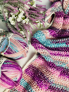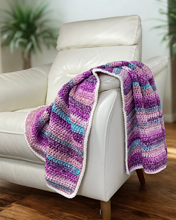 Worked in chunky yarn, it grows quickly and creates a soft, warm fabric that’s perfect for babies, toddlers, or even as a throw for your home. The sample is made using King Cole Hedgerow Chunky in Wildberry, which gives beautiful natural colour changes as you crochet — no yarn switching needed for the main body.