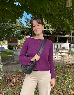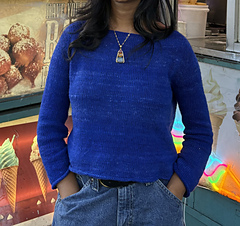 The #BreezyBlouse is a raglan blouse worked in the round, top-down, with german short row shaping on the yoke and rolled-stockinette edging.