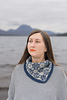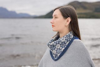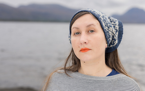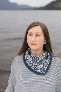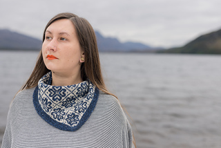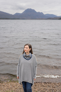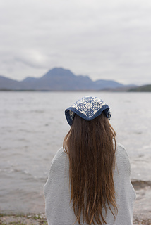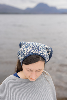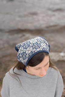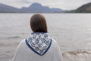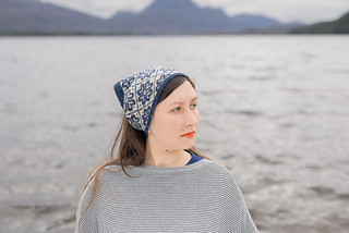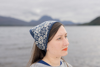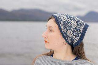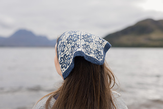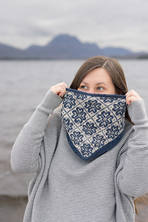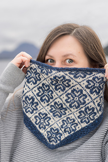 This triangular kerchief is knitted from long edge to tip, with a steek to enable working in the round. Stitches are decreased at an even rate along each side of the triangle and, after the final stitch is bound off and the steek secured and cut open, a garter stitch and i-cord edging is worked along each edge. I-cord ties enable the kerchief to be secured around the head or neck, and the steek can be finished with a ribbon facing, if desired.