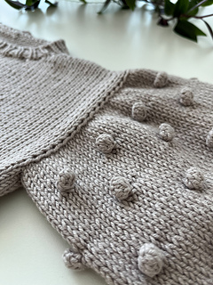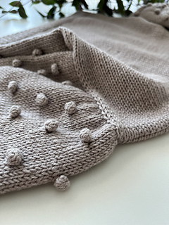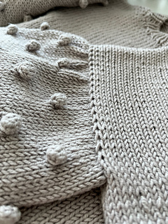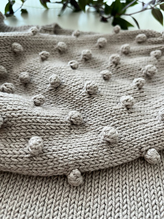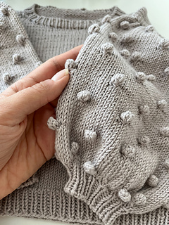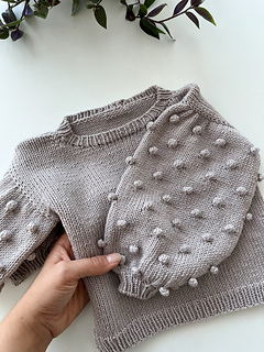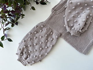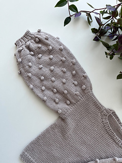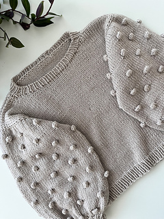 Brenna pullover is a fun and modern piece for little girls just as its name. This sweater therefore got fun little bobbles onto large puffed sleeves. The bobbles sure are interesting to touch for tiny hands. The body is kept simple to balance the fancy sleeves.