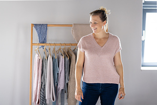 The Brevue shirt is started with a provisional cast-on at armpit height on the back. From there, knit upwards to the shoulders, where short rows first define the back and then the two front sections. Increases form the V-neck before the two front pieces are joined together and knitted in garter stitch to the desired length. After setting the front piece stitches aside, the provisional cast-on on the back is undone and the back is worked to the same length as the front piece. Short rows at the back ensure that the shirt is slightly longer at the back than at the front. Continue in the round over all stitches in the rib pattern for the hem before sewing it off with Italian bind-off. The si-des of the body are then closed using mattress stitch. For the sleeves, stitches are picked up from the edges of the front and back to work the ribbed cuff in rounds immediately afterwards, which also ends with an Italian finish. Finally, stitches for the V-neck are picked up from the front and neck. A ribbed collar is also knitted here and sewn in Italian. The knit overlaps in the middle of the V-neck, which is fixed directly using a special knit-on technique.