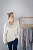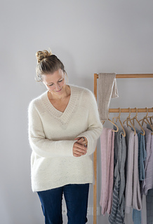 Der oversized geschnittene Sweater wird mit einem provisorischen Maschenanschlag am Rücken auf Achselhöhe begonnen. Von dort aus wird nach oben zu den Schultern gestrickt, wo verkürzte Reihen zuerst den Rücken und danach die beiden Vorderteile definieren. Zunahmen formen den V-Ausschnitt, bevor die beiden Vorderteile zusammengelegt und bis zur gewünschten Länge kraus rechts nach unten gestrickt werden. Nach dem Stilllegen der Vorderteilmaschen wird der provisorische Anschlag am Rücken aufgelöst und der Rücken auf dieselbe Länge wie das Vorderteil gearbeitet. Verkürzte Reihen am Rückenteil sorgen dafür, dass der Sweater hinten etwas länger fällt als vorn.