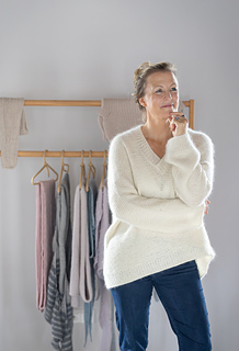 The oversized sweater is started with a provisional cast-on at the back at armpit height. From there, knit upwards towards the shoulders, where short rows first define the back and then the two front pieces. Increases form the V-neck before the two front pieces are joined and knitted down in garter stitch to the desired length. After binding off the front stitches, the provisional cast-on at the back is removed and the back is worked to the same length as the front. Short rows at the back ensure that the sweater is slightly longer at the back than at the front.