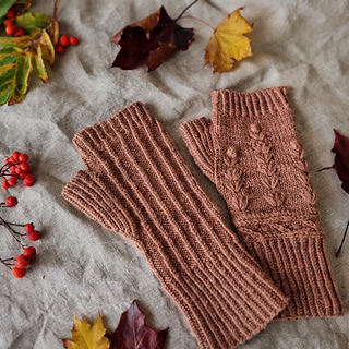 The Briar Gauntlets are a DK weight fingerless mitt, with a long cuff and are knitted in the round. They have a textured stitch pattern, representing different layers of the hedgerow.