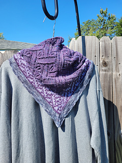 One thing leads to another. Yarn remained from the Cobblestone Court Wrap, and I wanted to play with the stitch patterns in another venue. Thus, this Bandana-shaped cowl came into being.