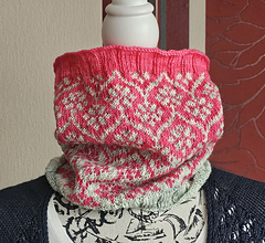 Purple is my favourite colour of all! When I saw these two purple yarns together, I just knew I had to do something fun with them. The dark purple has tiny flecks of colour in it; the light purple is soft as clouds. The motif on this stranded colourwork cowl merges and transforms in the middle - the main colour turns into the contrast colour and vice versa. These two yarns go together so well, and the resulting knit fabric is soft and supple – perfect for a cozy wintertime accessory. Brigda is Old English for a change or play of colours.