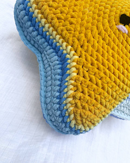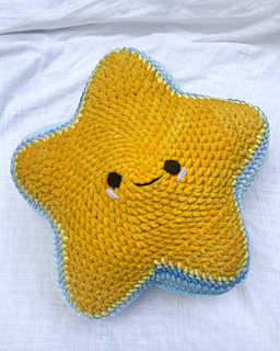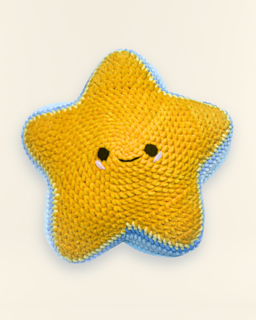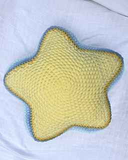 Star is made up of two separate panels that are worked in the round and then sewn together. To change yarn colors, work up to the final pull-through with the old color, completing the stitch with the new color. Work over the strand of old color as you work each row.