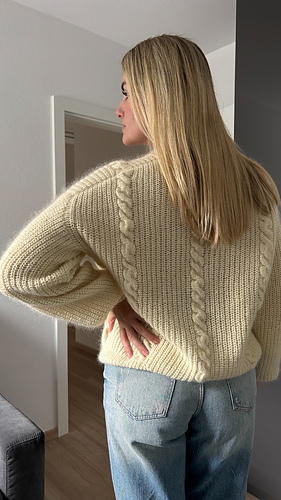 The sweater is knitted top-down. First, the back yoke is knitted with increases. Stitches are then picked up along each shoulder and the two front pieces are knitted one after the other and the neckline is formed. After that, the front parts are joined and the front is knitted in rows until the required length for the armholes is reached. Then, the front and back pieces are joined and knitting continues in the round. Next, stitches are picked up along the armholes to work the sleeves in the round. Finally, stitches are picked up to work the neckline in 1x1 ribbing.