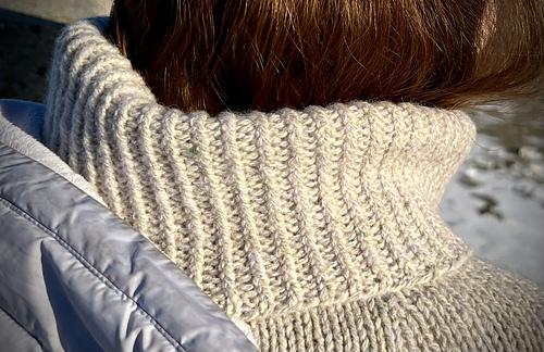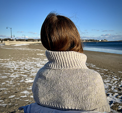 This little capelet is worked from the bottom up, beginning with twisted stitch ribbing. Stockinette is worked over the arms and chest, with decreases at the shoulders before the neck is completed by a cozy collar of twisted stitch ribbing.