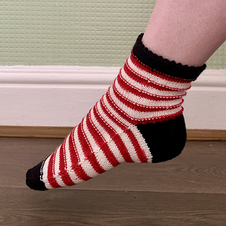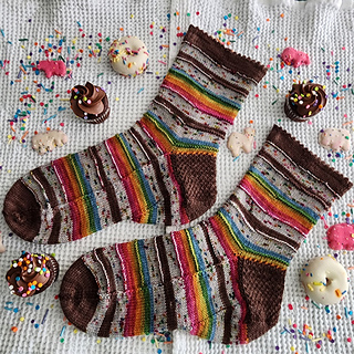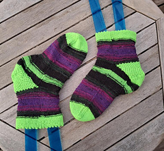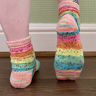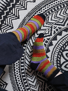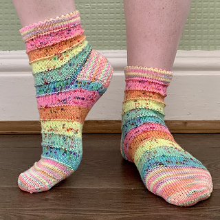 You will need about 75-100g of your main self-striping yarn (or a total of 75-100g of mini skeins or scraps), and 25-30g of a contrast colour for your picot cuff, heel and toe.