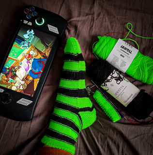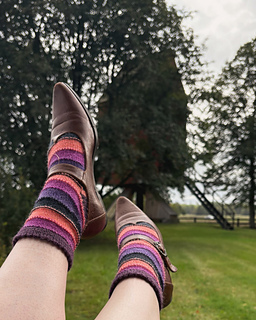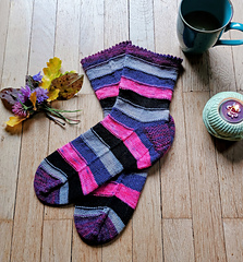 Broom Rider’s Socks is a pattern featuring a picot edge around the cuff, garter ridges with a slip stitch border along the instep, and a gusset under the foot, for maximum cozy fit.
