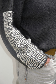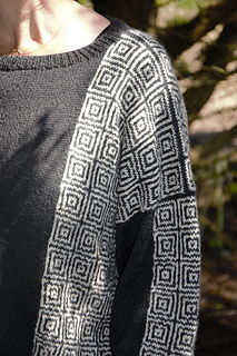 Le pull est tricoté en quatre pièces : le devant, le dos, et les deux manches. Les mailles de l’encolure sont relevées pour être tricotées en côtes. Les emmanchures droites sont très faciles à assembler, ce qui confère à ce modèle une ampleur particulièrement confortable.