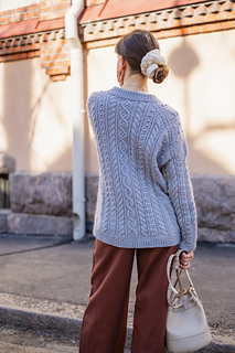 The sweater is worked top down seamlessly with charts for the different sections. You’ll most likely learn the different patterns and cable motifs by heart quickly so you can enjoy the process while working on this engaging project. The work begins by shaping the back yoke flat while increasing for the shoulder seams. Then stitches are picked up from the right and left shoulder for the front yoke. The front and back yokes are joined together and worked in the round for the body. Stitches are picked