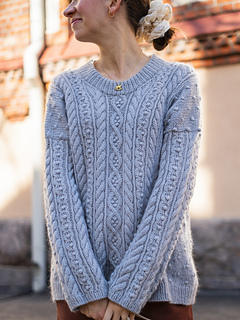 The sweater has a dropped shoulder with wide and extra-long sleeves for a feminine and cozy look. You can customize the sleeve and body length to fit your preferences.