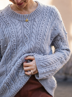 The sweater can be worked by holding two strands of fingering weight yarn together with one strand of lace weight yarn or with one strand of DK weight yarn together with one strand of lace weight yarn.
