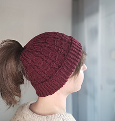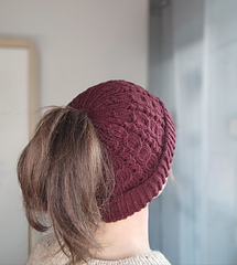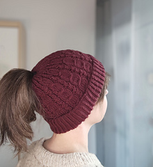 The hat is knitted from the top down using DK-weight yarn. A double brim in half-brioche stitch keeps your ears wonderfully warm, while the optional ponytail opening ensures that longer hair stays comfortably in place.