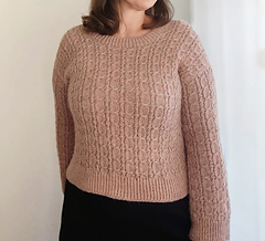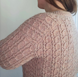 The Budburst Sweater is worked seamlessly from the top down with a European drop shoulder construction. First, the back is worked flat in rows. Stitches for the shoulders are then picked up and worked one after the other before being joined together. Once the front and back are joined, the sweater is completed in the round. The ribbings are worked in twisted rib.