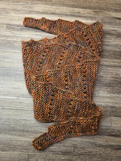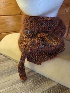 Skjerfet er strikket i håndfarget garn som har 400 meter på 50 gr. Det gikk med 50 gr håndfarget og 15 gr Kid-silk. Det kan benyttes restegarn til skjerfet da en kan feste trådene i hestetømmen (icord).