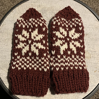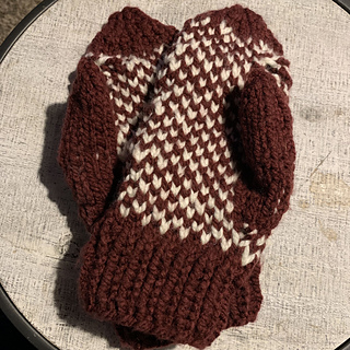 Any 2 colors of bulky yarn will work. I used less than one skein of each. I also put holes for texting in each mitten.